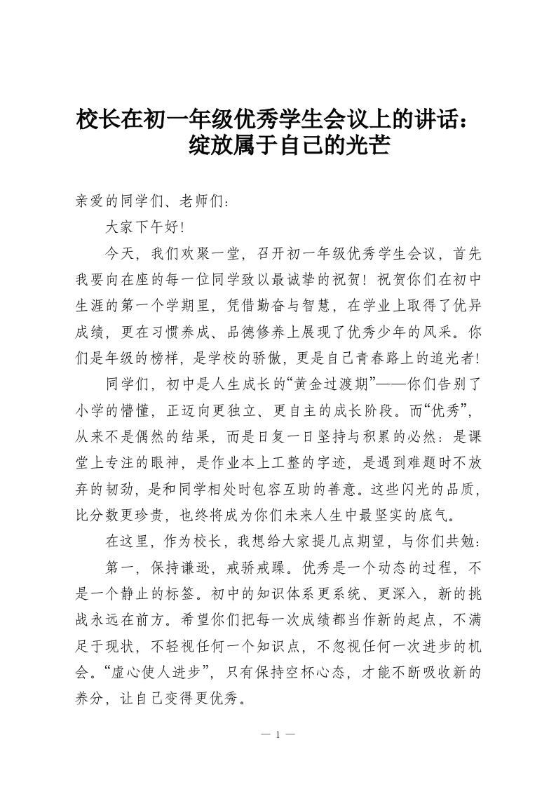 校长在初一年级优秀学生会议上的讲话:绽放属于自己的光芒亲爱的同学们、老师们:大家下午好!今天,我们欢聚一堂,召开初一年级优秀学生会议,首先我要向在座的每一位同学致以最诚挚的祝贺!祝贺你们在初中生涯的第一个学期里,凭借勤奋与智慧,在学业上取得了优异成绩,更在习惯养成、品德修养上展现了优秀少年的风采。你们是年级的榜样,是学校的骄傲,更是自己青春路上的追光者!同学们,初中是人生成长的“黄金过渡期”一一你们告别了小学的懵懂,正迈向更独立、更自主的成长阶段。而“优秀”,从来不是偶然的结果,而是日复一日坚持与积累的必然:是课堂上专注的眼神,是作业本上工整的字迹,是遇到难题时不放弃的韧劲,是和同学相处时包容互助的善意。这些闪光的品质,比分数更珍贵,也终将成为你们未来人生中最坚实的底气。在这里,作为校长,我想给大家提几点期望,与你们共勉:第一,保持谦逊,戒骄戒躁。优秀是一个动态的过程,不是一个静止的标签。初中的知识体系更系统、更深入,新的挑战永远在前方。希望你们把每一次成绩都当作新的起点,不满足于现状,不轻视任何一个知识点,不忽视任何一次进步的机会。“虚心使人进步”,只有保持空杯心态,才能不断吸收新的养分,让自己变得更优秀。