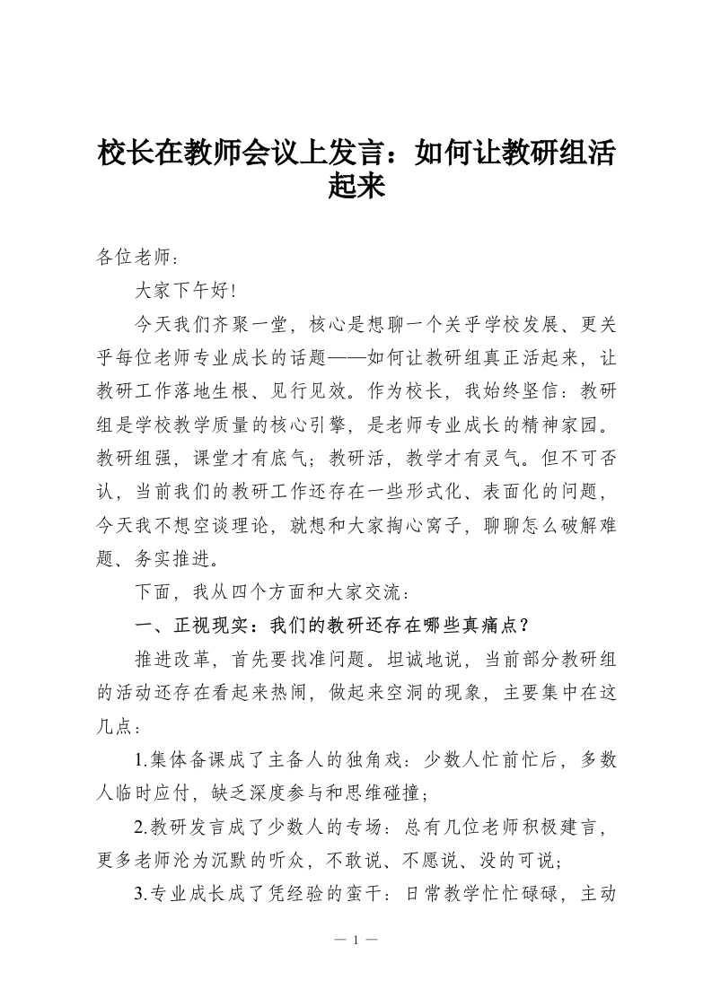 校长在教师会议上发言:如何让教研组活起来各位老师:大家下午好!今天我们齐聚一堂,核心是想聊一个关乎学校发展、更关乎每位老师专业成长的话题一一如何让教研组真正活起来,让教研工作落地生根、见行见效。作为校长,我始终坚信:教研组是学校教学质量的核心引擎,是老师专业成长的精神家园。教研组强,课堂才有底气;教研活,教学才有灵气。但不可否认,当前我们的教研工作还存在一些形式化、表面化的问题,今天我不想空谈理论,就想和大家掏心窝子,聊聊怎么破解难题、务实推进。下面,我从四个方面和大家交流:一、正视现实:我们的教研还存在哪些真痛点?推进改革,首先要找准问题。坦诚地说,当前部分教研组的活动还存在看起来热闹,做起来空洞的现象,主要集中在这几点:1.集体备课成了主备人的独角戏:少数人忙前忙后,多数人临时应付,缺乏深度参与和思维碰撞;2教研发言成了少数人的专场:总有几位老师积极建言,更多老师沦为沉默的听众,不敢说、不愿说、没的可说;3.专业成长成了凭经验的蛮干:日常教学忙忙碌碌,主动1