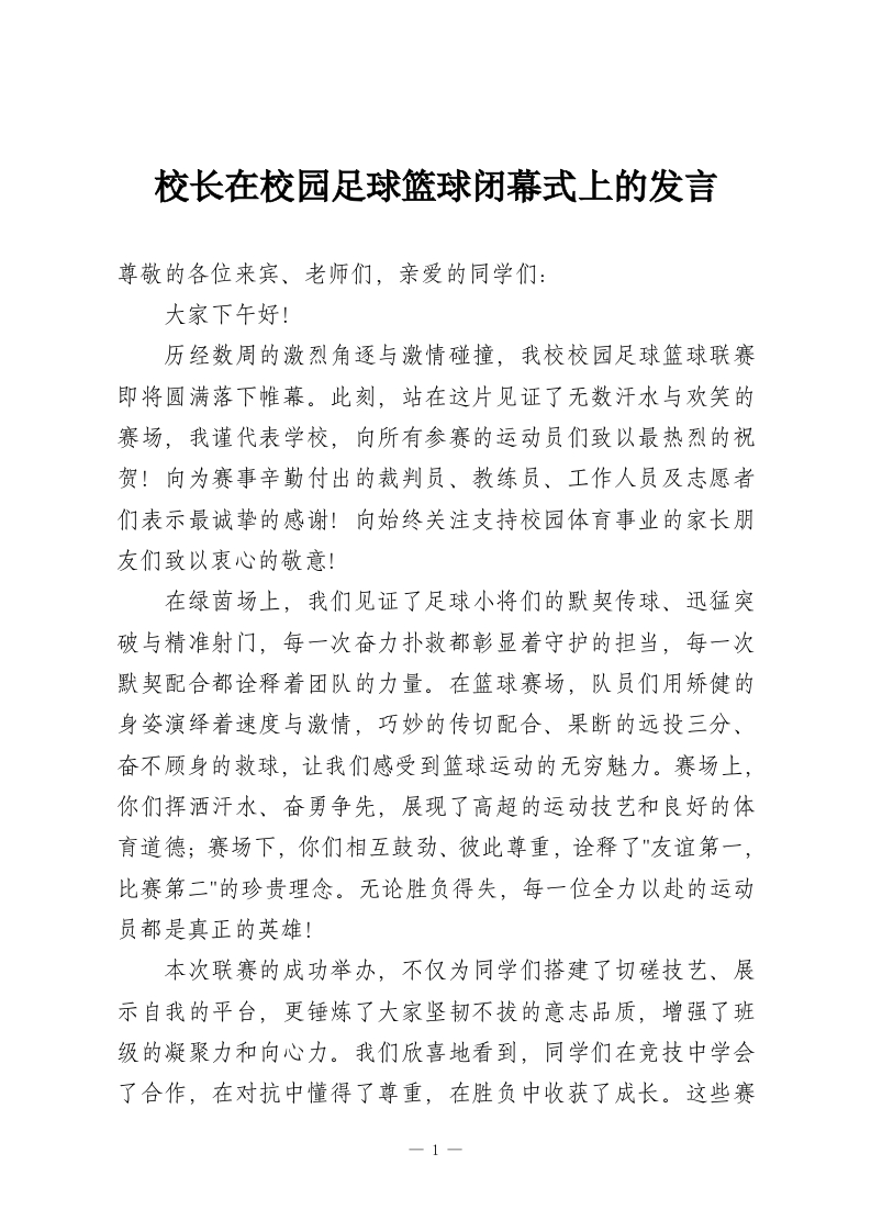 校长在校园足球篮球闭幕式上的发言尊敬的各位来宾、老师们,亲爱的同学们:大家下午好!历经数周的激烈角逐与激情碰撞,我校校园足球篮球联赛即将圆满落下帷幕。此刻,站在这片见证了无数汗水与欢笑的赛场,我谨代表学校,向所有参赛的运动员们致以最热烈的祝贺!向为赛事辛勤付出的裁判员、教练员、工作人员及志愿者们表示最诚挚的感谢!向始终关注支持校园体育事业的家长朋友们致以衷心的敬意!在绿茵场上,我们见证了足球小将们的默契传球、迅猛突破与精准射门,每一次奋力扑救都彰显着守护的担当,每一次默契配合都诠释着团队的力量。在篮球赛场,队员们用矫健的身姿演绎着速度与激情,巧妙的传切配合、果断的远投三分、奋不顾身的救球,让我们感受到篮球运动的无穷魅力。赛场上,你们挥洒汗水、奋勇争先,展现了高超的运动技艺和良好的体育道德;赛场下,你们相互鼓劲、彼此尊重,诠释了“友谊第一,比赛第二”的珍贵理念。无论胜负得失,每一位全力以赴的运动员都是真正的英雄!本次联赛的成功举办,不仅为同学们搭建了切磋技艺、展示自我的平台,更锤炼了大家坚韧不拔的意志品质,增强了班级的凝聚力和向心力。我们欣喜地看到,同学们在竞技中学会了合作,在对抗中懂得了尊重,在胜负中收获了成长。这些赛1-