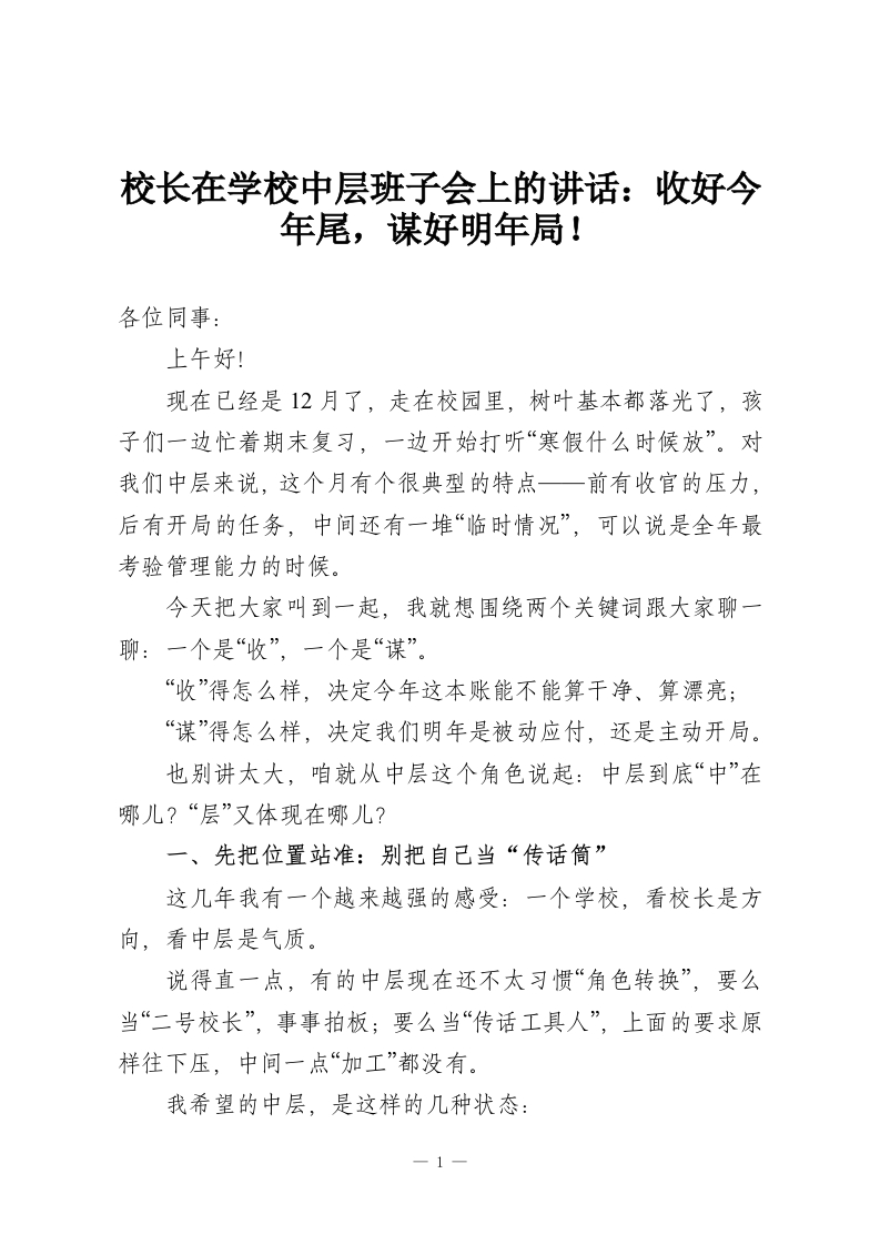 校长在学校中层班子会上的讲话:收好今年尾,谋好明年局!各位同事:上午好!现在已经是12月了,走在校园里,树叶基本都落光了,孩子们一边忙着期末复习,一边开始打听“寒假什么时候放”。对我们中层来说,这个月有个很典型的特点一前有收官的压力,后有开局的任务,中间还有一堆“临时情况”,可以说是全年最考验管理能力的时候。今天把大家叫到一起,我就想围绕两个关键词跟大家聊一聊:一个是“收”,一个是“谋”。“收”得怎么样,决定今年这本账能不能算干净、算漂亮;“谋”得怎么样,决定我们明年是被动应付,还是主动开局。也别讲太大,咱就从中层这个角色说起:中层到底“中”在哪儿?“层”又体现在哪儿?一、先把位置站准:别把自己当“传话筒”这几年我有一个越来越强的感受:一个学校,看校长是方向,看中层是气质。说得直一点,有的中层现在还不太习惯“角色转换”,要么当“二号校长”,事事拍板;要么当“传话工具人”,上面的要求原样往下压,中间一点“加工”都没有。我希望的中层,是这样的几种状态: