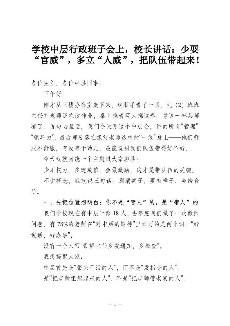 学校中层行政班子会上,校长讲话:少耍“官威”,多立“人威”,把队伍带起来!各位主任、各位中层同事:下午好!刚才从三楼办公室走下来,我顺手看了一眼,九(2)班班主任刘老师还在改作业,桌上摞着两大摞试卷,旁边一杯茶都凉了。说句心里话,我们今天开这个中层会,讲的所有“管理”“领导力”,最后都要落在像刘老师这样的“一线”身上一他们舒服不舒服,有没有干劲儿,最能说明我们队伍带得好不好。今天我就围绕一个主题跟大家聊聊:少用权力,多建威信,会做激励,这才是带队伍的关键。不讲概念,我就说三句话:别端架子、要有样子、会给台阶。一、先把位置想明白:你不是“管人”的,是“带人”的我们学校现在有中层干部18人,去年底我们做了一次教师问卷,有78%的老师在“对中层的期待”里面写的是两个词:“好说话、好办事”。没有一个人写“希望主任多发通知,多检查”。我想提醒大家:中层首先是“带头干活的人”,而不是“发指令的人”;是“把老师组织起来的人”,不是“把老师管老实的人”。1