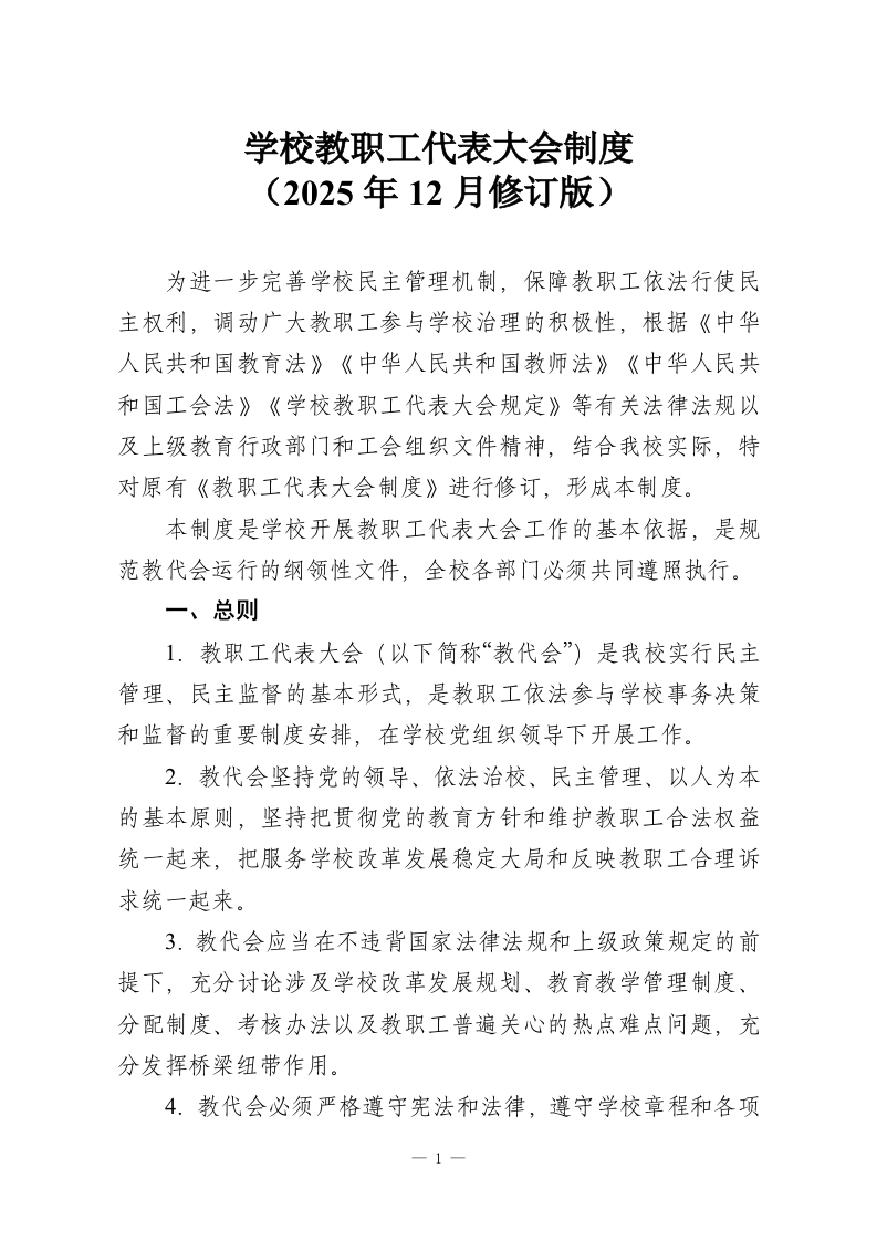 学校教职工代表大会制度(2025年12月修订版)为进一步完善学校民主管理机制,保障教职工依法行使民主权利,调动广大教职工参与学校治理的积极性,根据《中华人民共和国教育法》《中华人民共和国教师法》《中华人民共和国工会法》《学校教职工代表大会规定》等有关法律法规以及上级教育行政部门和工会组织文件精神,结合我校实际,特对原有《教职工代表大会制度》进行修订,形成本制度。本制度是学校开展教职工代表大会工作的基本依据,是规范教代会运行的纲领性文件,全校各部门必须共同遵照执行。一、总则1.教职工代表大会(以下简称“教代会”)是我校实行民主管理、民主监督的基本形式,是教职工依法参与学校事务决策和监督的重要制度安排,在学校党组织领导下开展工作。2.教代会坚持党的领导、依法治校、民主管理、以人为本的基本原则,坚持把贯彻党的教育方针和维护教职工合法权益统一起来,把服务学校改革发展稳定大局和反映教职工合理诉求统一起来。3.教代会应当在不违背国家法律法规和上级政策规定的前提下,充分讨论涉及学校改革发展规划、教育教学管理制度、分配制度、考核办法以及教职工普遍关心的热点难点问题,充分发挥桥梁纽带作用。4.教代会必须严格遵守宪法和法律,遵守学校章程和各项