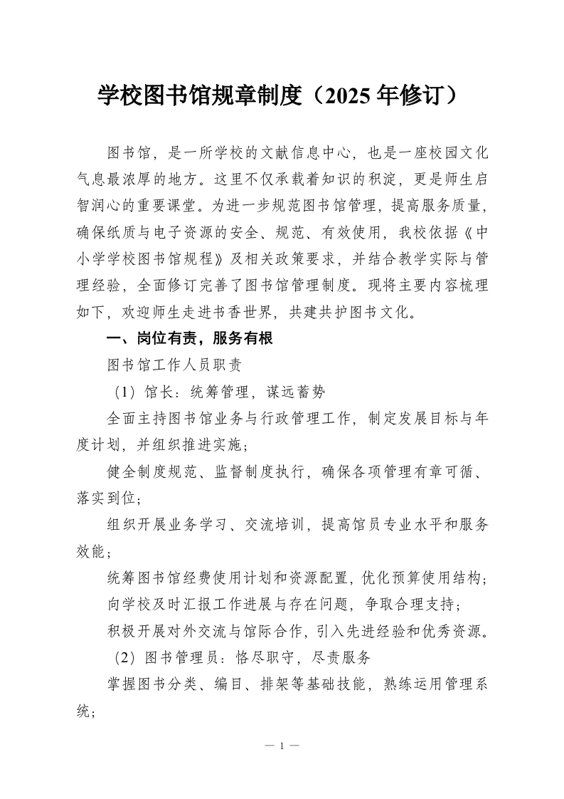 学校图书馆规章制度(2025年修订)图书馆,是一所学校的文献信息中心,也是一座校园文化气息最浓厚的地方。这里不仅承载着知识的积淀,更是师生启智润心的重要课堂。为进一步规范图书馆管理,提高服务质量,确保纸质与电子资源的安全、规范、有效使用,我校依据《中小学学校图书馆规程》及相关政策要求,并结合教学实际与管理经验,全面修订完善了图书馆管理制度。现将主要内容梳理如下,欢迎师生走进书香世界,共建共护图书文化。一、岗位有责,服务有根图书馆工作人员职责(1)馆长:统筹管理,谋远蓄势全面主持图书馆业务与行政管理工作,制定发展目标与年度计划,并组织推进实施;健全制度规范、监督制度执行,确保各项管理有章可循、落实到位;组织开展业务学习、交流培训,提高馆员专业水平和服务效能;统筹图书馆经费使用计划和资源配置,优化预算使用结构;向学校及时汇报工作进展与存在问题,争取合理支持;积极开展对外交流与馆际合作,引入先进经验和优秀资源。(2)图书管理员:恪尽职守,尽责服务掌握图书分类、编目、排架等基础技能,熟练运用管理系